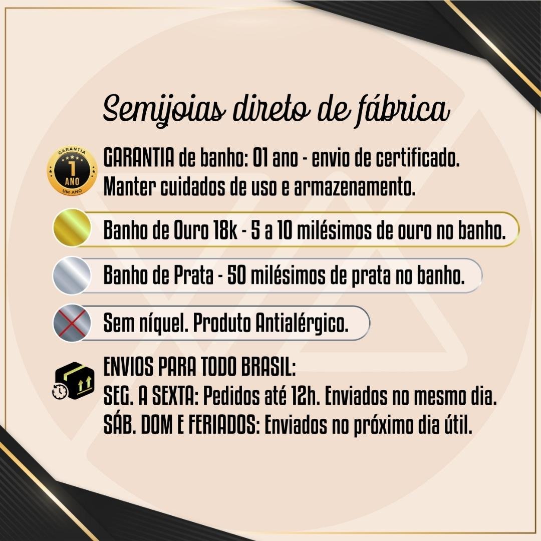 Produto com tecnologia Antialérgica Paládio, livre de níquel. Nossas semi joias possuem banho de excelente qualidade e alta durabilidade, não descasca ou perde a cor com facilidade.