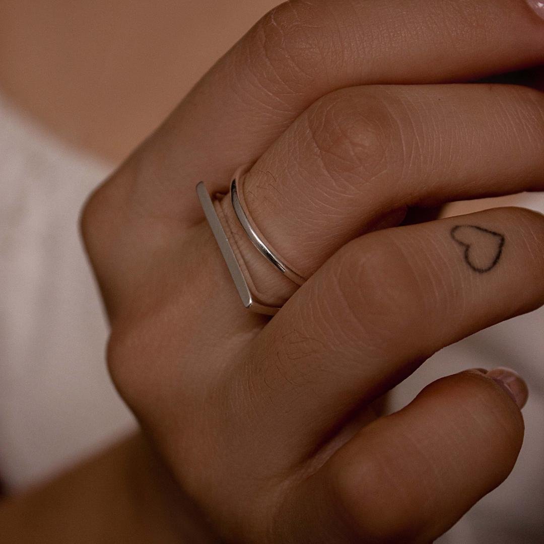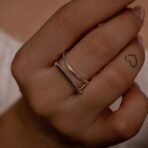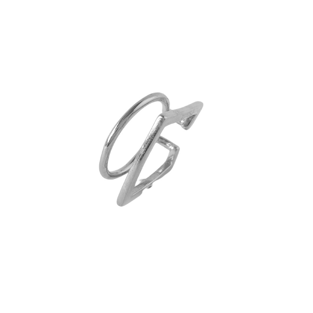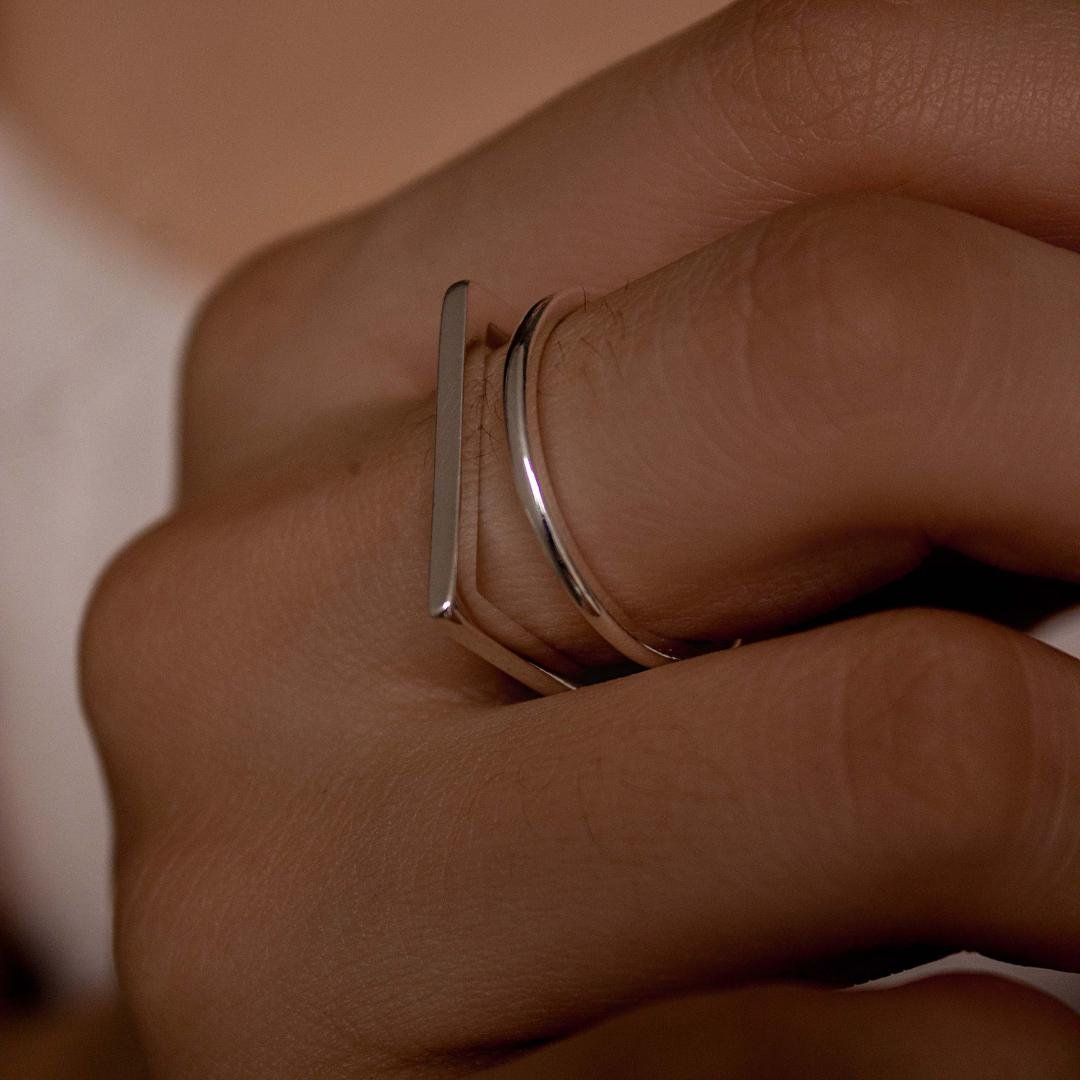 Anel modelo ajustável, metal liso, duplo com formas geométricas, semi joia banhado a prata.