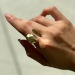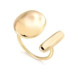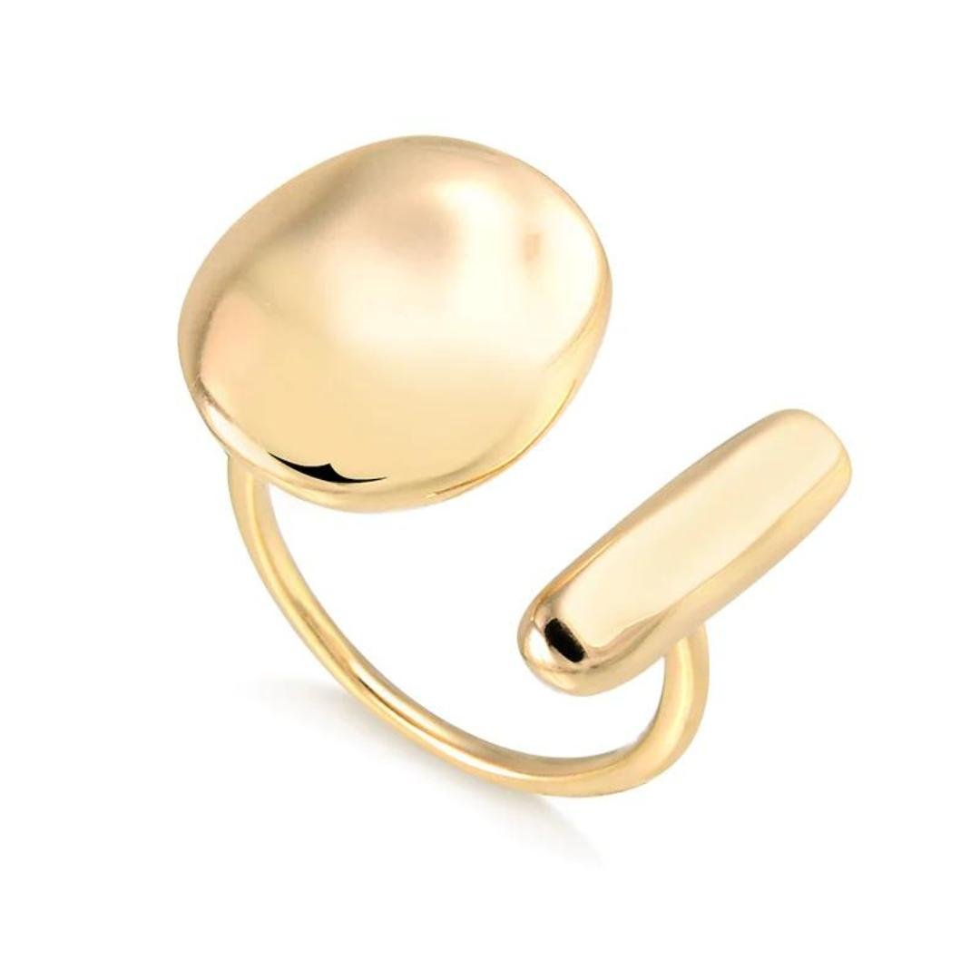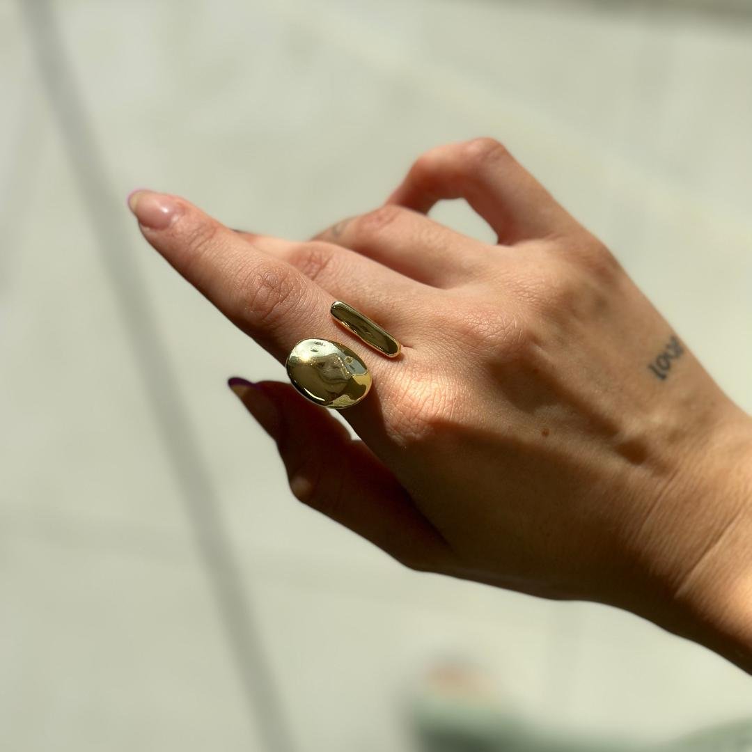 Anel modelo ajustável, metal liso, em formato aberto e orgânico que está super em alta, semi joia banhado a ouro 18k.