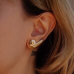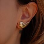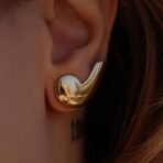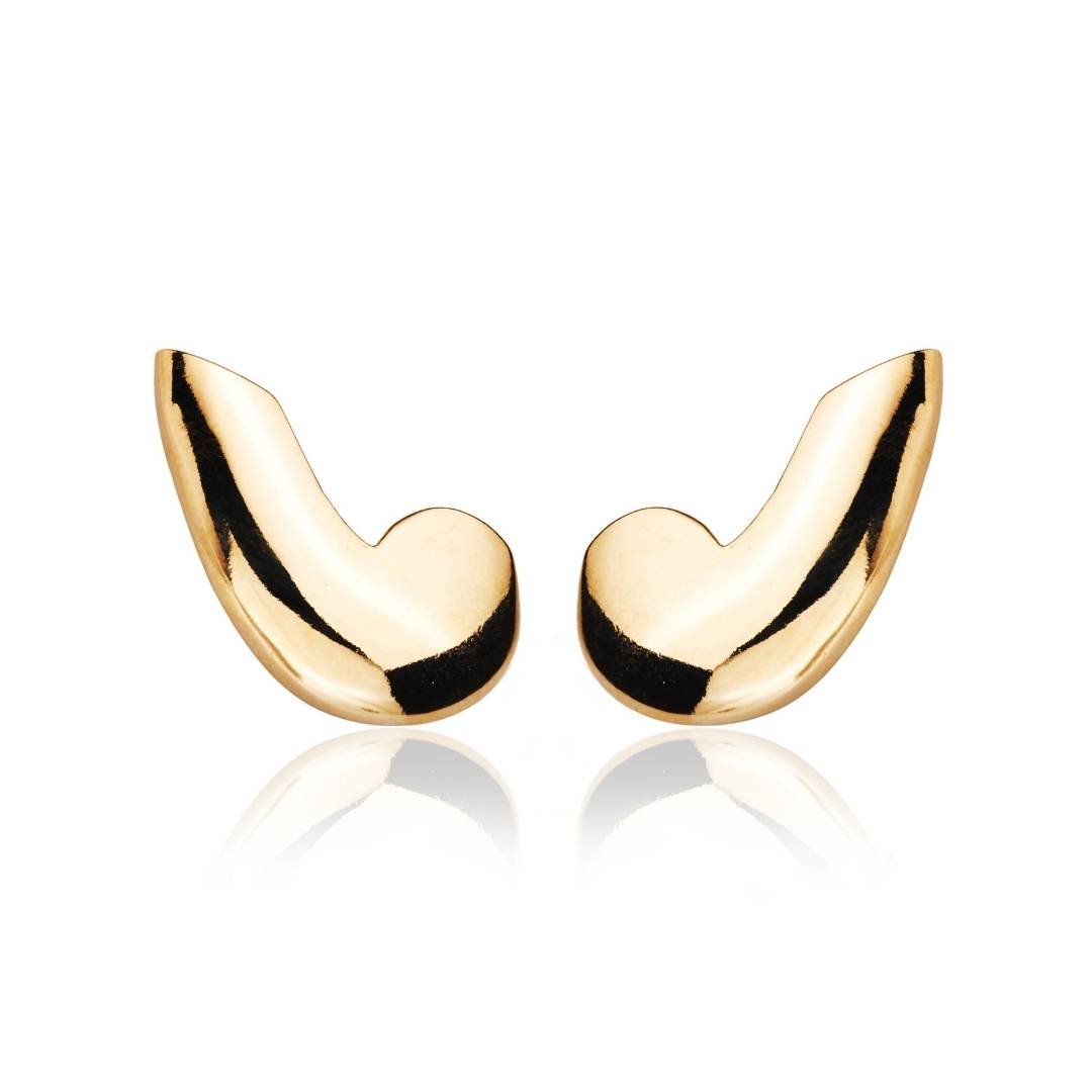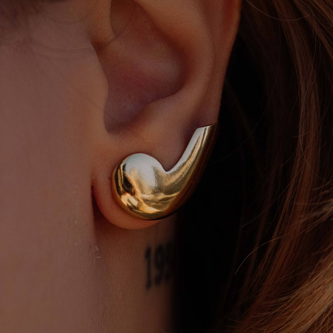 Brinco modelo ear cuff, com design diferenciado formando uma virgula, metal liso. Semi jóia banhada a ouro 18k.