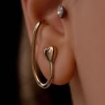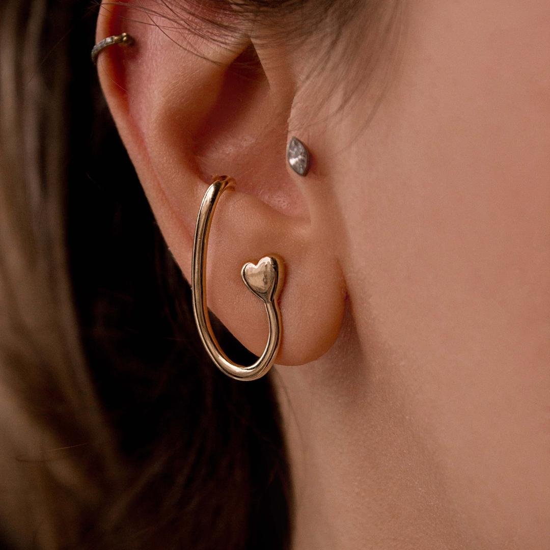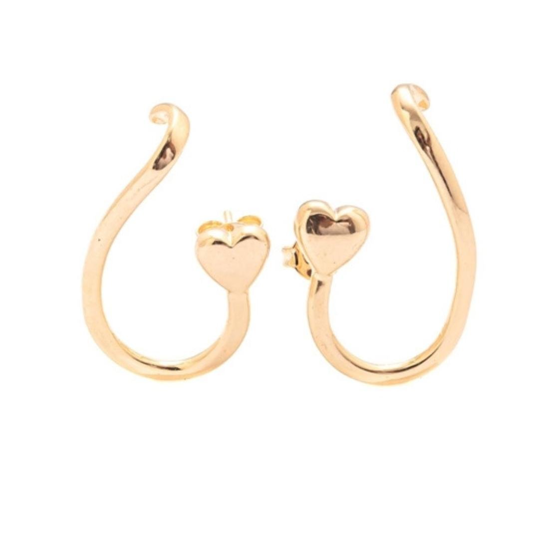 Brinco modelo ear hook, com design diferenciado, detalhe em coração, metal liso. Semi jóia banhada a ouro 18k.