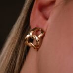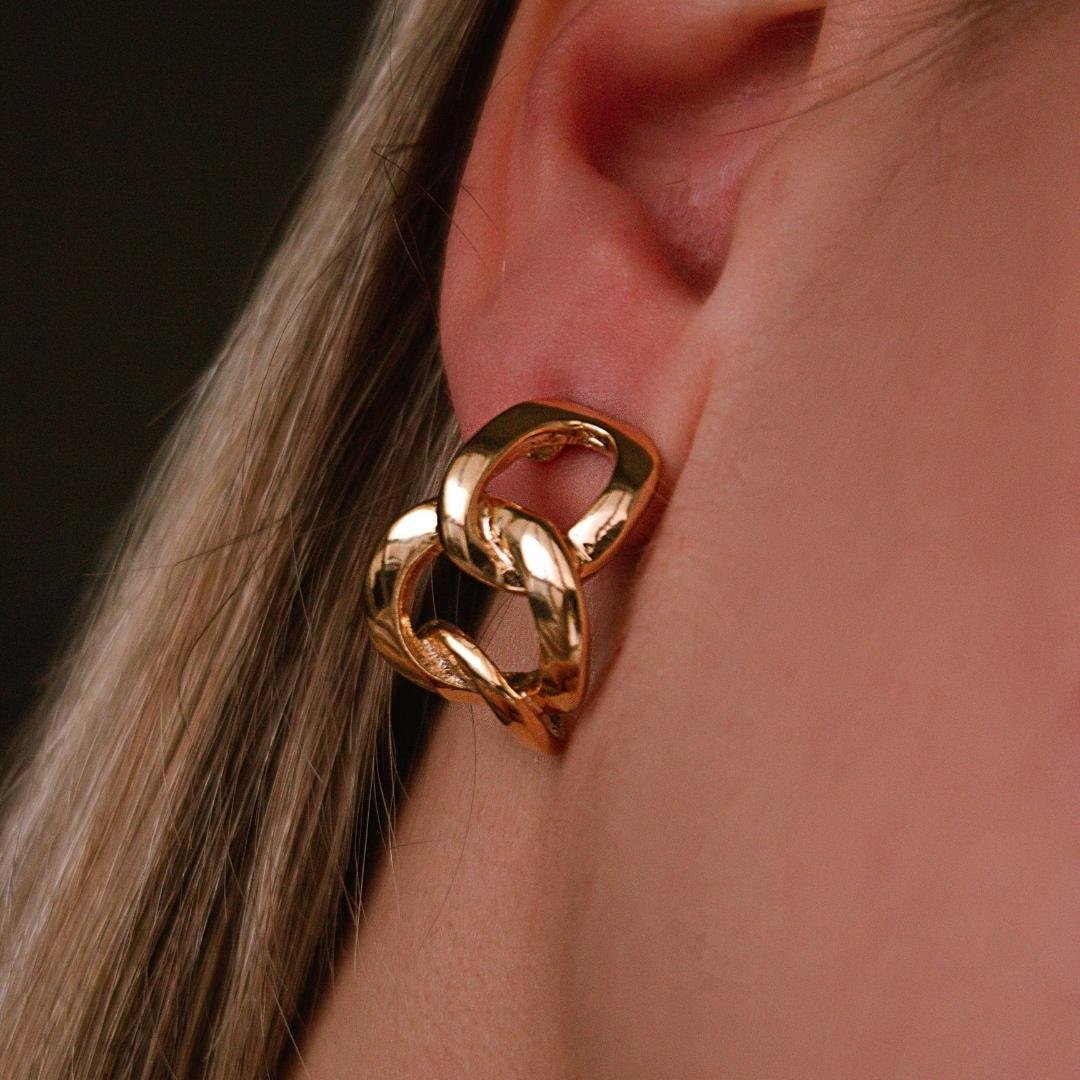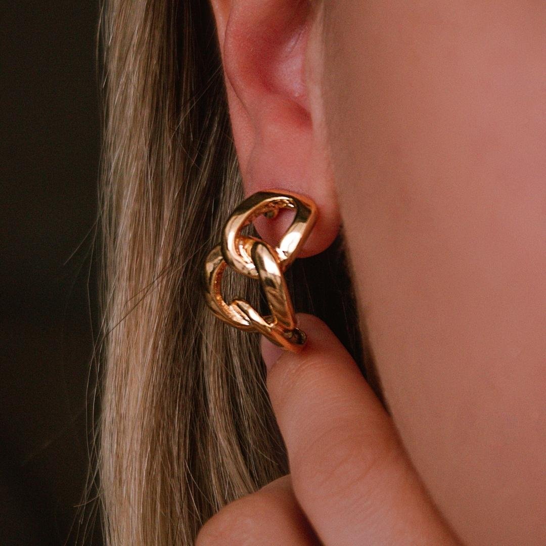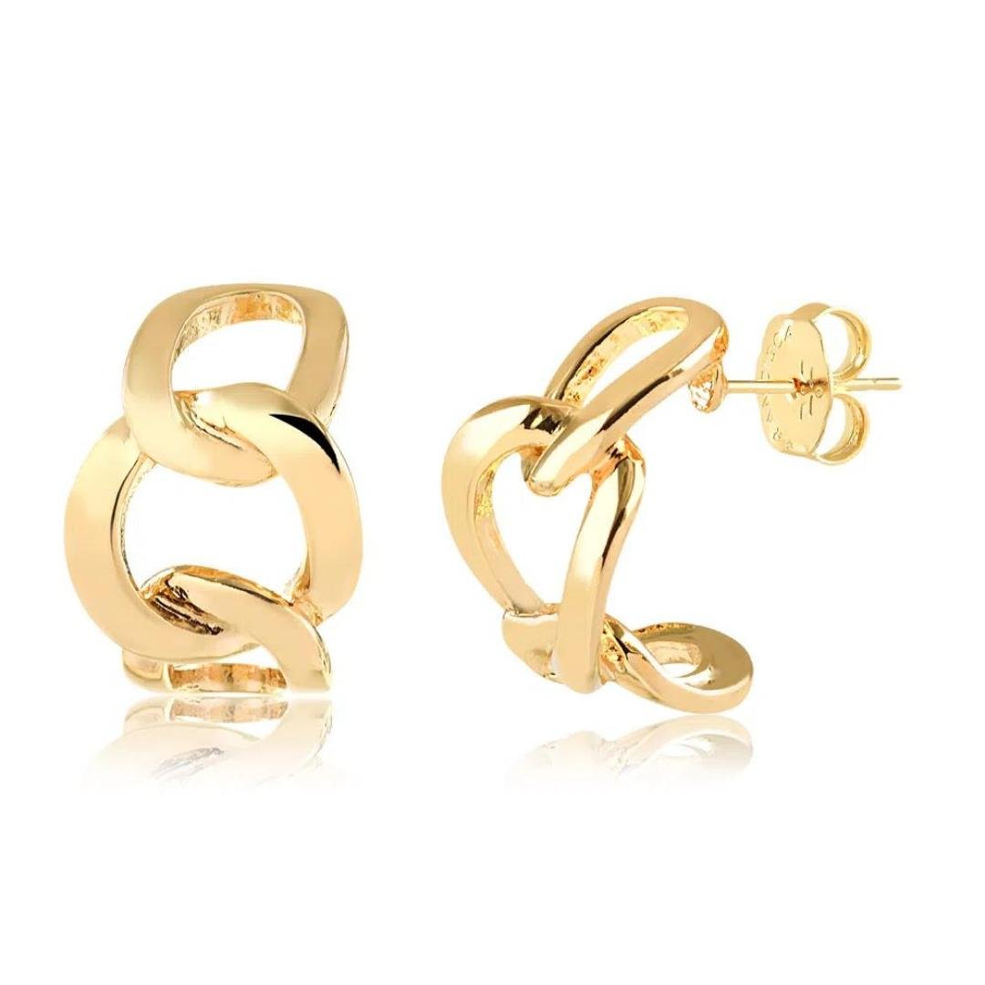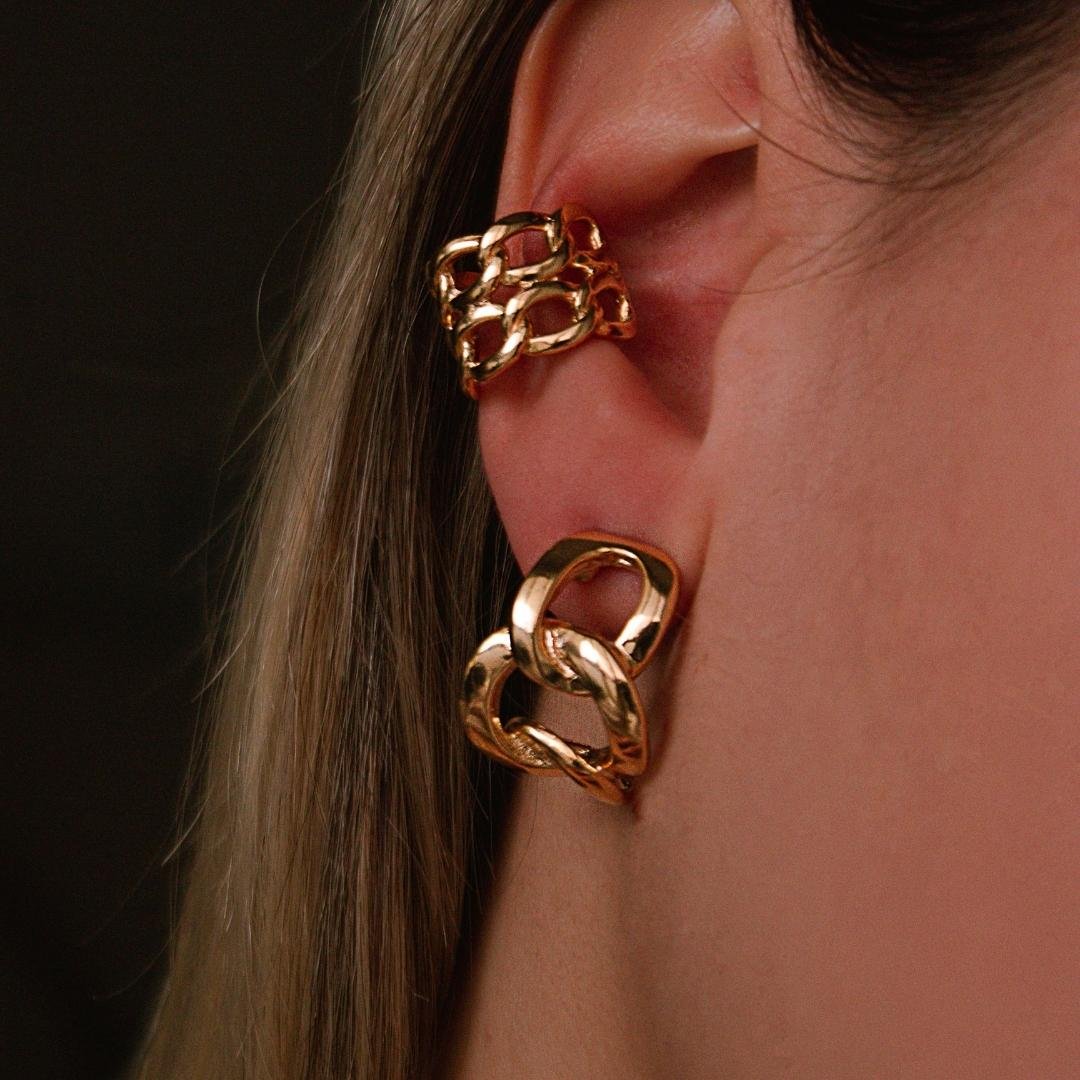 Brinco modelo ear hook, metal liso, em formato de corrente, semi jóia banhado a ouro 18k.
