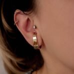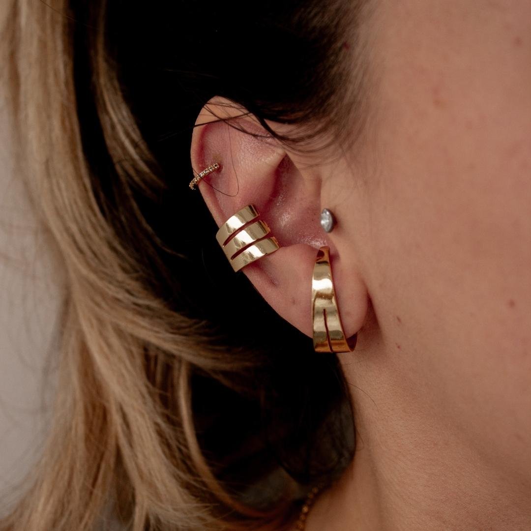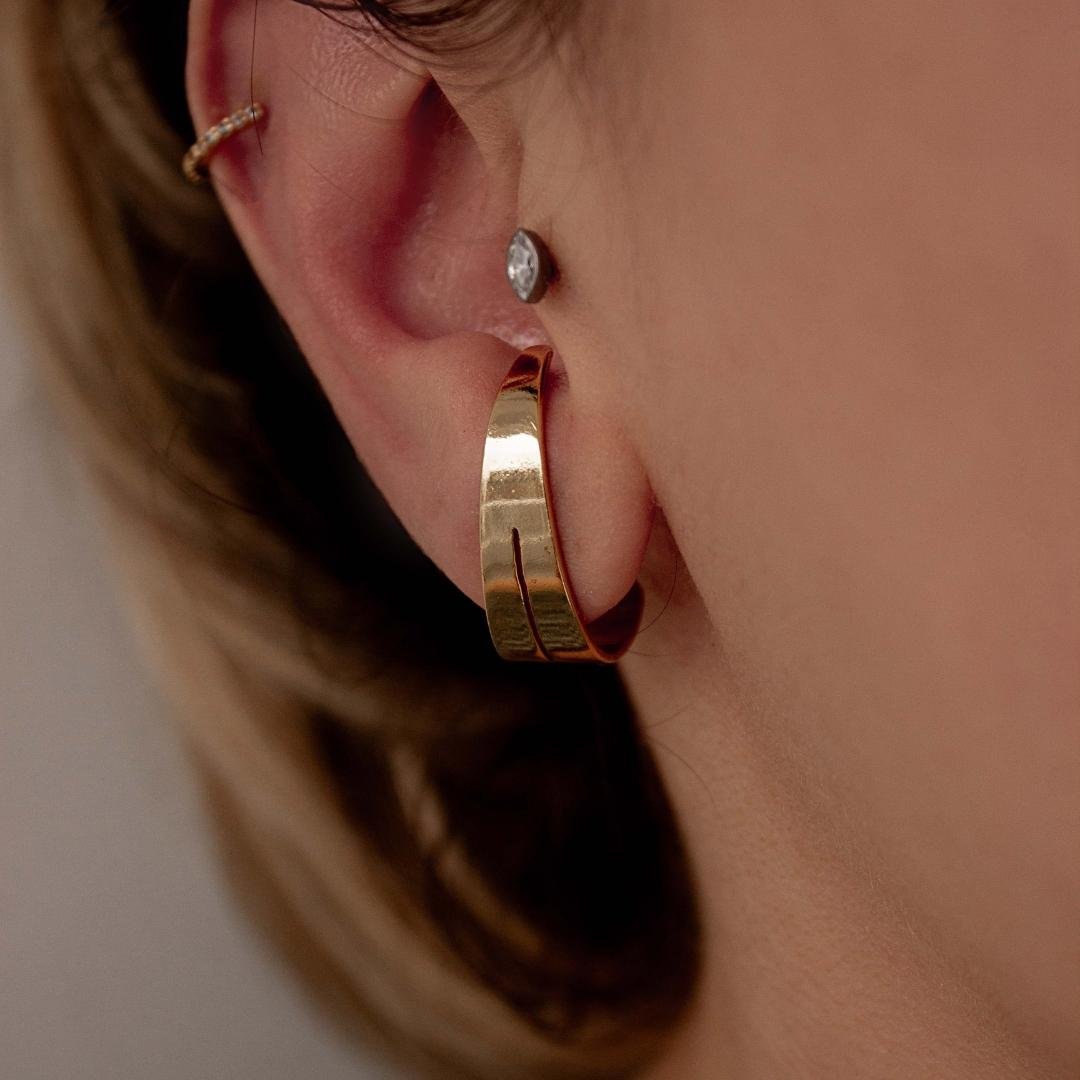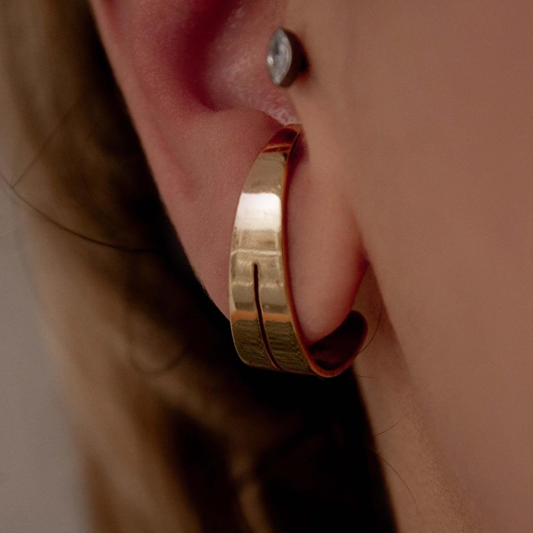 Brinco modelo ear hook, duplo com chapa mais larga, metal liso. Semi jóia banhada a ouro 18k.