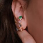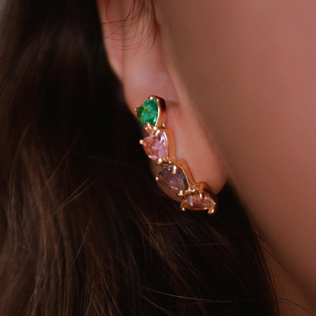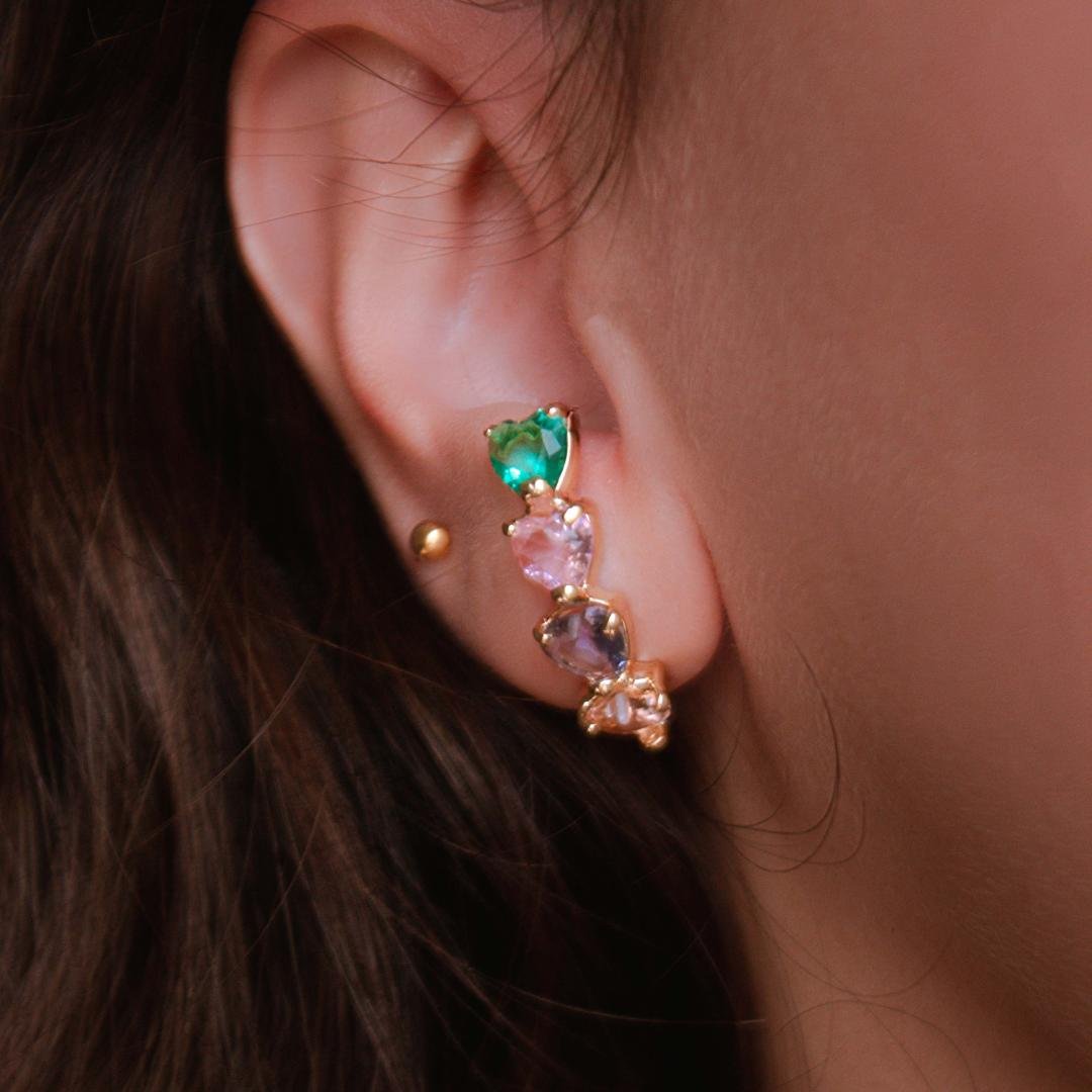 Brinco modelo ear hook, com zircônias coloridas em formato de coração , semi jóia banhado a ouro 18k.