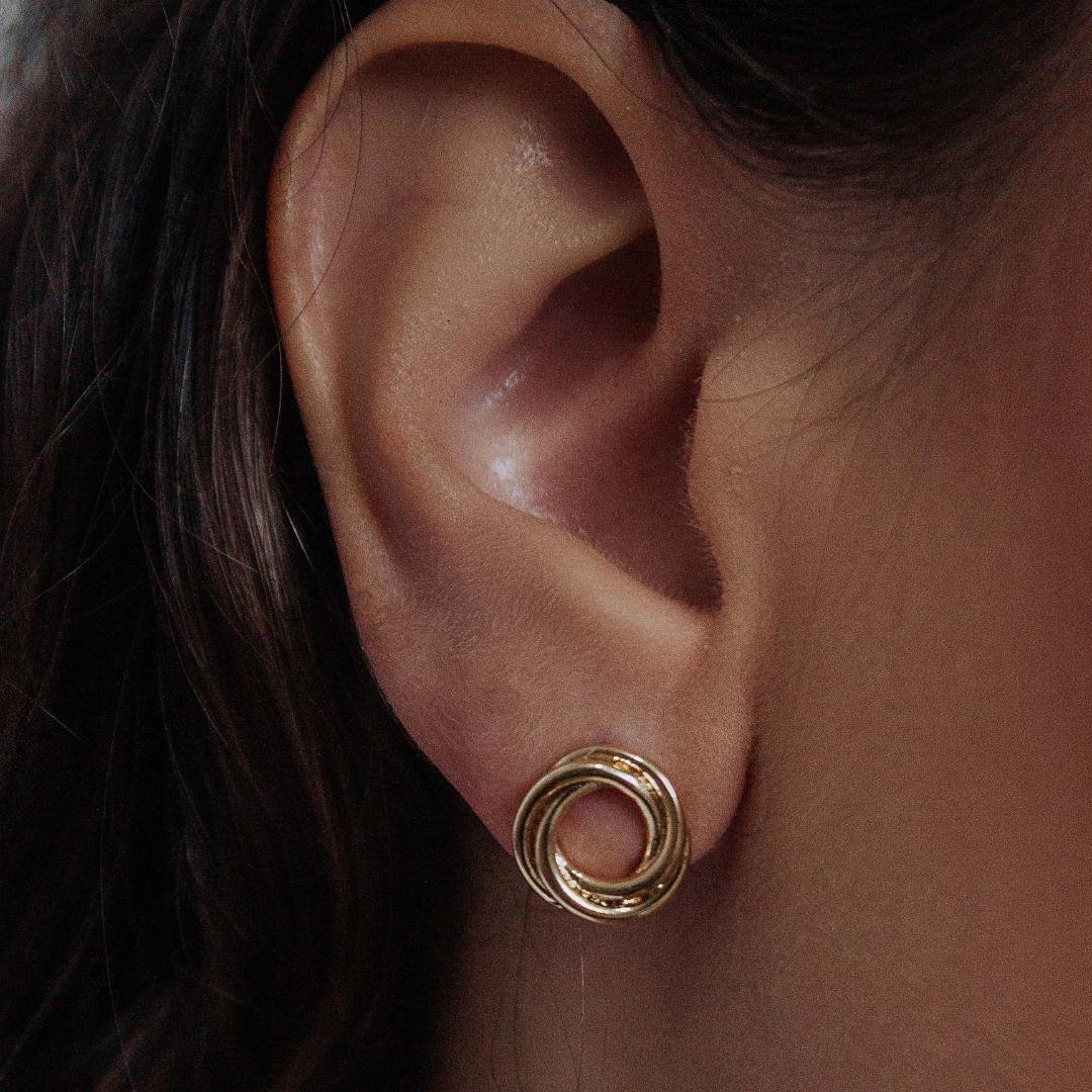 Brinco modelo redondo, formado por dois aros, metal liso. Semi jóia banhada a ouro 18k.