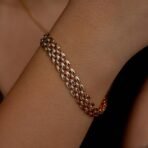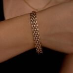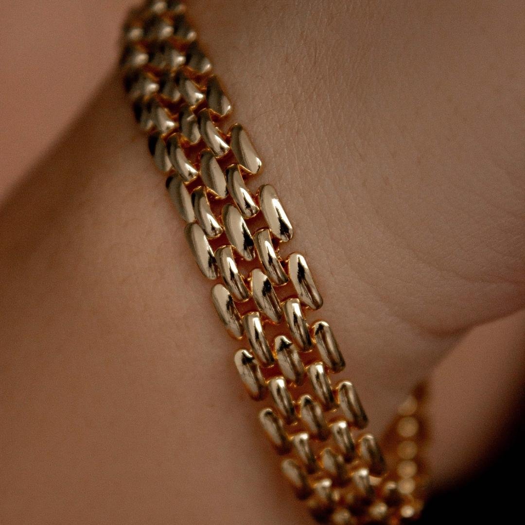 Pulseira corrente malha elos trabalhado metal liso, semi jóia banhada a ouro 18k.
