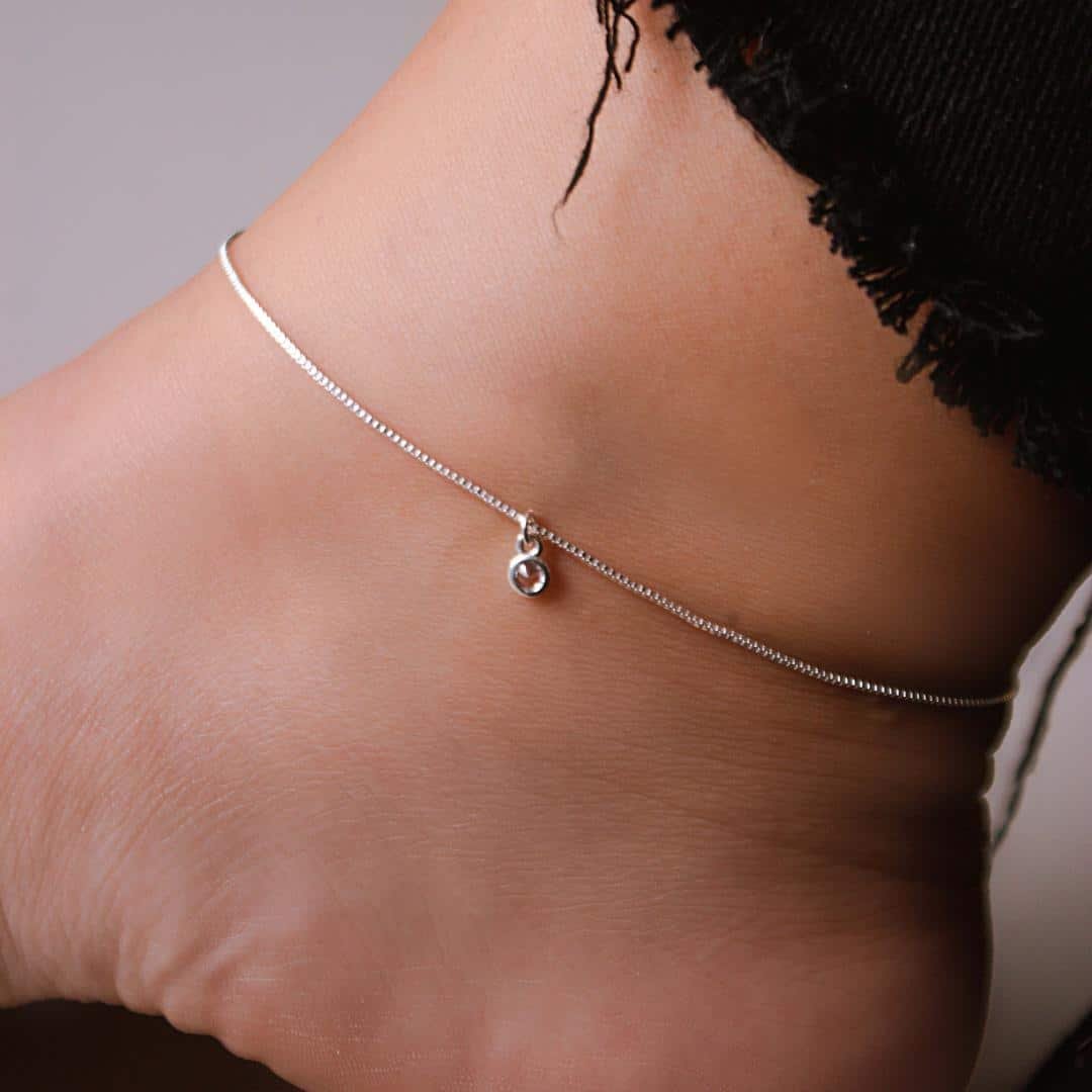 Tornozeleira modelo corrente veneziana e ponto de luz, semi joia banhada a prata.